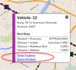 Another function available in the Vehicle Location Map is a view showing the progress of a vehicle on its current route. To see this route progress view, click on a vehicle icon on the map and select "Route Progress" from the information box as shown to the right. This will open up the street view shown below.